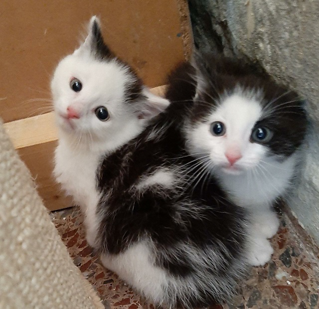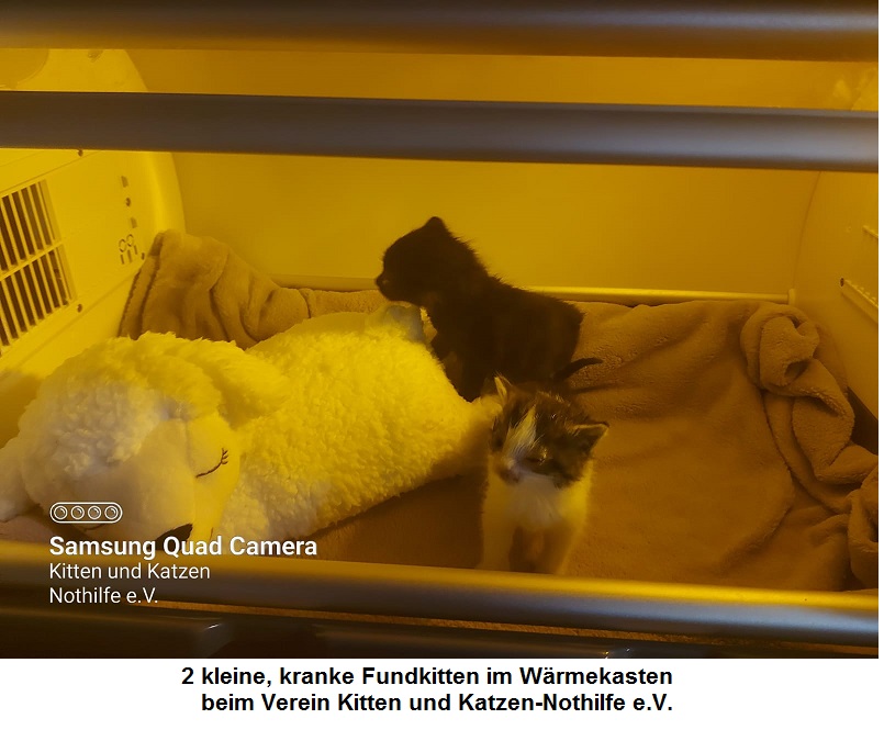 oder diese beiden kleinen Fundkitten, die schwer an Katzenschnupfen leiden